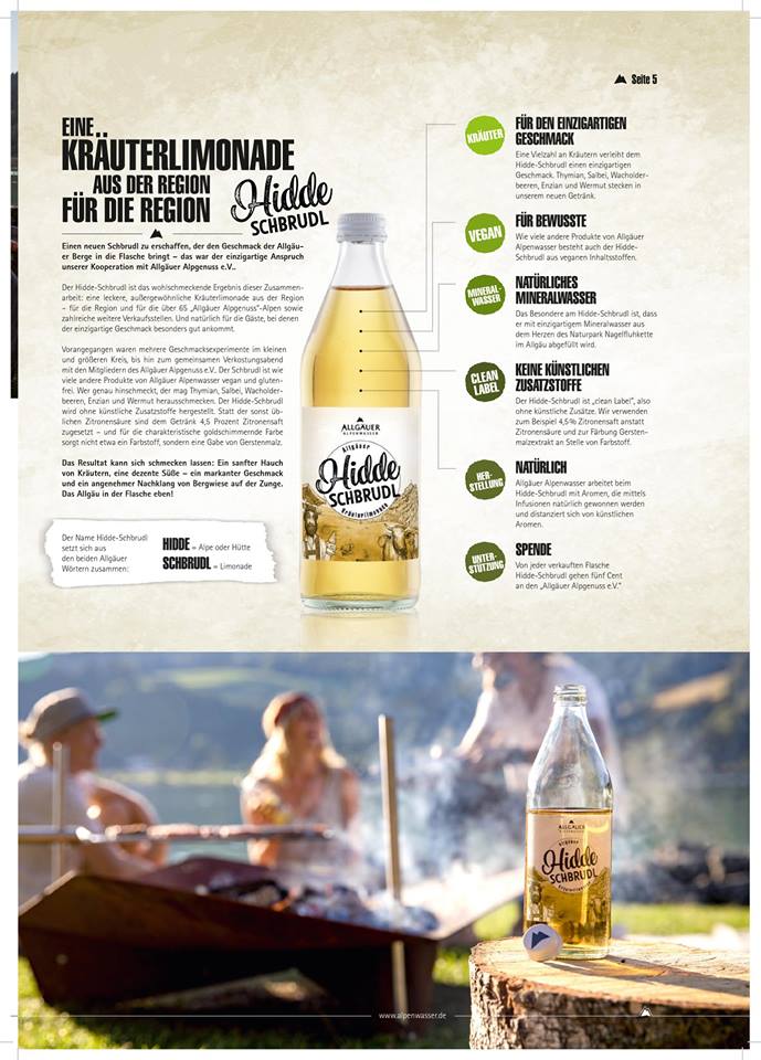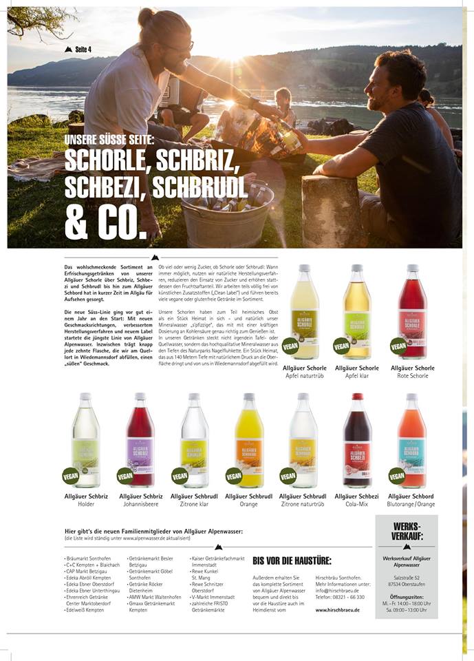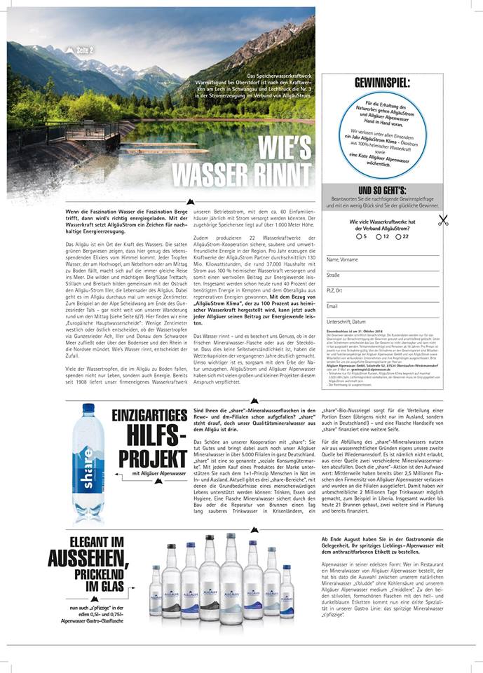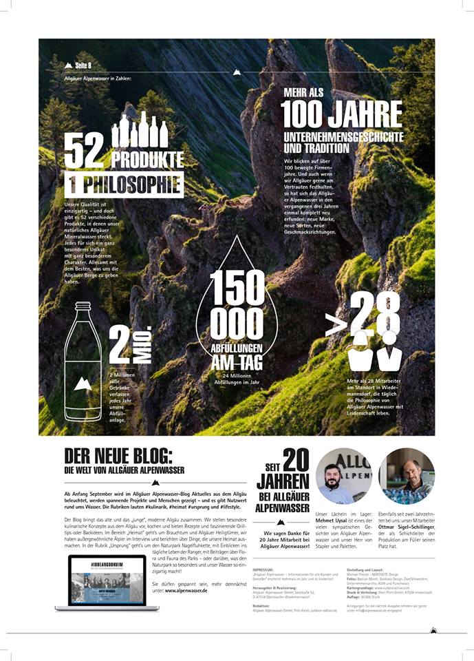Wer mag, kann sich ein gedrucktes Exemplar der Zeitung bei info@alpenwasser.de bestellen, auch im Werksverkauf vom Allgäuer Alpenwasser sind die Magazine zu haben! Danke an Stephanie Kindlmann für die immer frischen Ideen, danke an Michi Prestel von Nordseite Design für die inspirierende Grafik – und danke ans Allgäuer Alpenwasser, das für uns ein Produkt ist, mit dem wir uns zu 100 Prozent identifizieren können. Umso schöner ist es, acht Seiten mit alpenwasserfrischen Texten zu füllen!