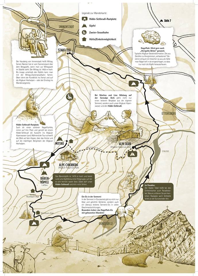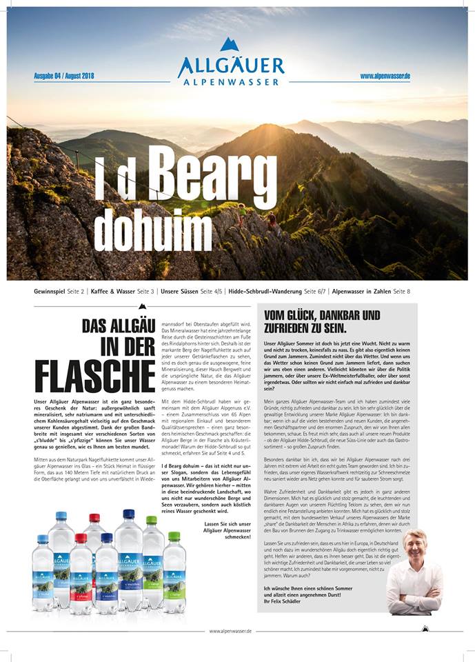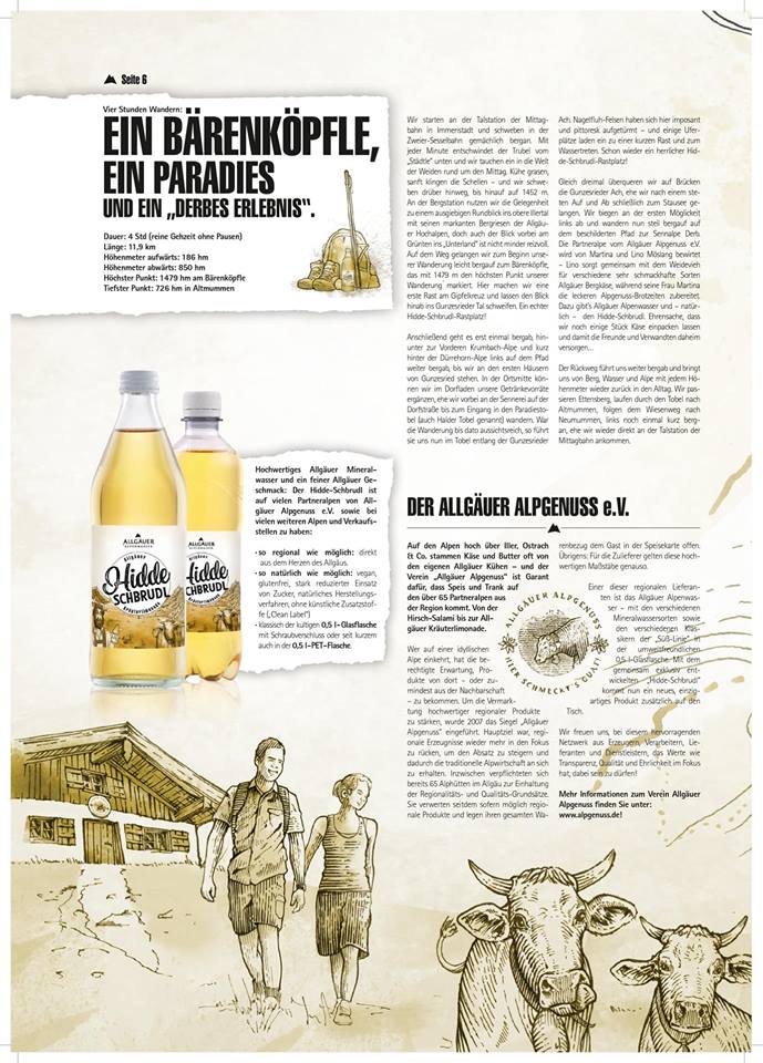 Wir haben für die aktuelle Ausgabe sämtliche Texte beigesteuert, zudem steckt jede Menge Idee, Konzept und Detail von uns in der achtseitigen Zeitung, die 85.000 Mal gedruckt wurde und in der Allgäuer Zeitung beigelegt wurde. Wie immer entstand das Unternehmensmagazin in Rekordzeit, wie immer haben wir einen dynamischen Prozess der Themen-Findung und -Modfikation hinter uns – und wie immer hat es Spaß gemacht, die acht Seiten mit Leben (und Content) zu füllen. Besonders stolz sind wir auf die letzte Doppelseite, auf der wir eine unsere Lieblingswanderungen vorstellen: Vom Mittag zum Bärenköpfle, durch den Paradiestobel und hinauf zu Martina und Lino auf der Sennalpe Derb zur Einkehr. Mit einer ansprechenden Grafik im Hidde-Schbrudl-Style und richtig coolen Grafik – und Content-Snippets.